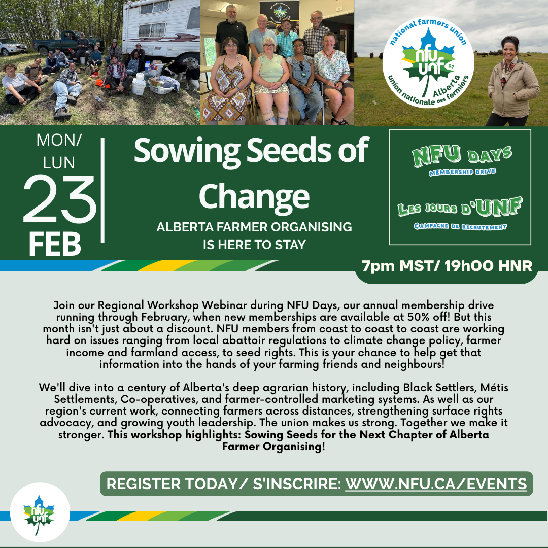 Participez à notre webinaire régional pendant les Journées de l’UNF, notre campagne annuelle d’adhésion qui se déroule jusqu’en février, au cours de laquelle les nouvelles adhésions bénéficient d’une réduction de 50 % ! Mais ce mois-ci n’est pas qu’une question de rabais. Les membres de l’UNF d’un océan à l’autre travaillent d’arrache-pied sur des questions allant de la réglementation des abattoirs locaux à la politique sur le changement climatique, en passant par le revenu des fermières, l’accès aux terres agricoles et les droits sur les semences. C’est l’occasion pour vous de contribuer à mettre ces informations entre les mains de vos amis et voisins agriculteurs !