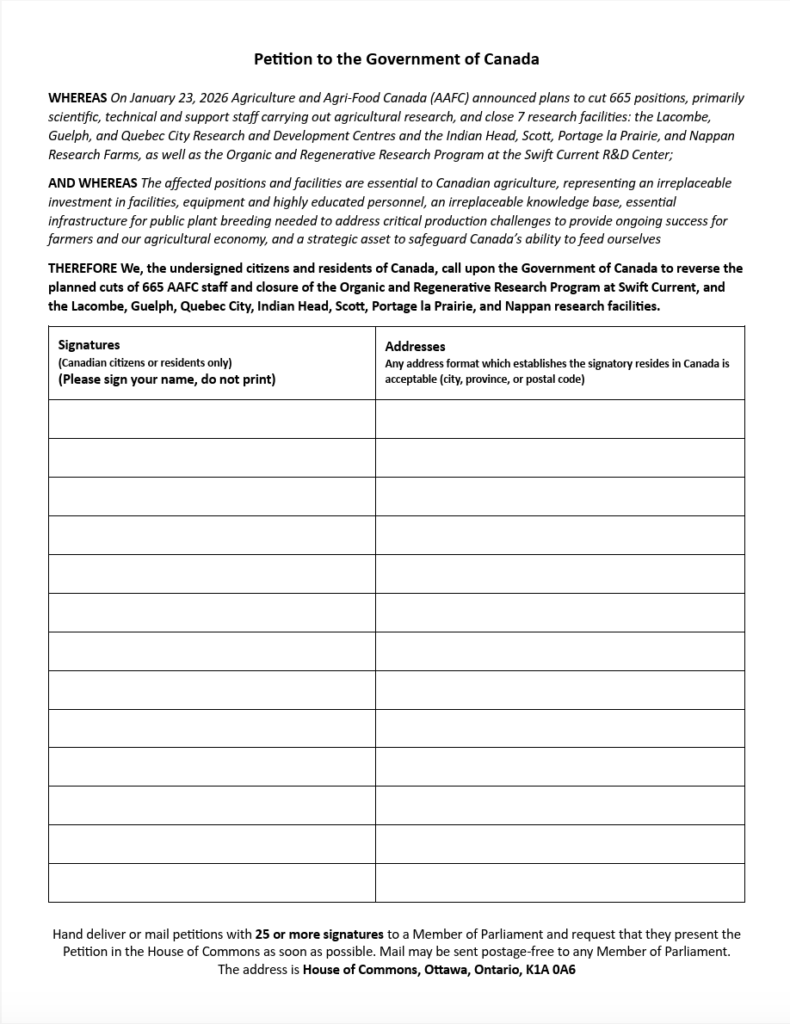 The agricultural community was shocked to learn Agriculture and Agri-Food Canada plans to close critically important research facilities in Alberta, Saskatchewan, Manitoba, Ontario, Quebec and Nova Scotia, and to end the Organic and Regenerative Research Program, and to terminate 12% of AAFC personnel – 665 researchers, technicians, and support staff whose experience, knowledge and skills are highly specialized. Farm organizations are unanimous in denouncing these cuts.